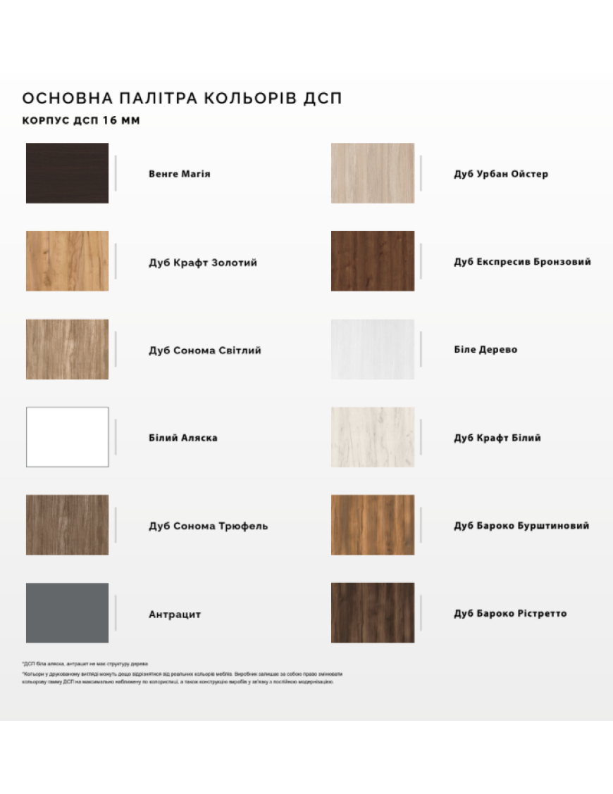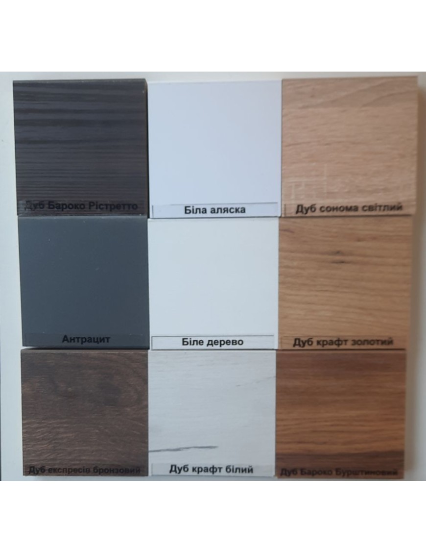 | Колір | Дуб Барокко рістрето^Аляска біла^Дуб сонома світлий^Антрацит^Біле дерево^Дуб крафт золотий^Дуб експресів бронзовий^Дуб крафт білий^Дуб Барокко бурштиновий |